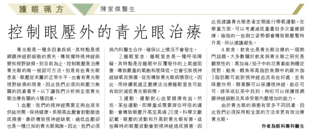 我们的视神经需要足够血液来供给所需,保持健康。长期高血压会对动脉造成损害,最终导致视神经缺氧;过低血压却也是一种已知的青光眼风险。因此,我们必须与内科医生合作,确保以上情况不会发生。