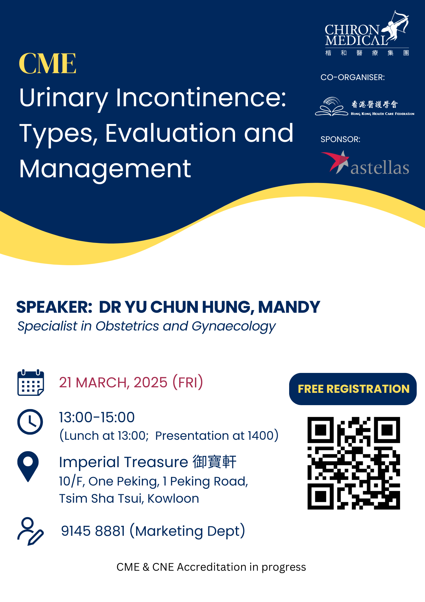 Chiron Medical, in collaboration with the Hong Kong Health Care Federation, will be hosting a Continuing Medical Education (CME) seminar on March 21. This event will feature Dr. Yu Chun Hung, Mandy, a specialist in Obstetrics and Gynaecology, who will lead an in-depth discussion on the types, evaluation, and management of urinary incontinence.