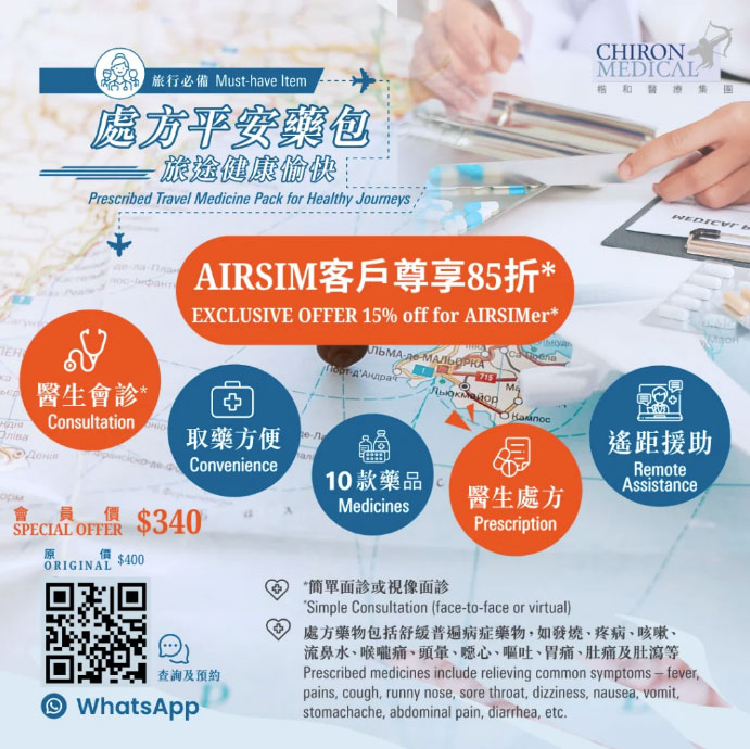 Chiron Medical introduces prescribed travel medicine service that is based on individual medical history to provide a simple consultation and a travel medicine pack targeting common travel-related illnesses including medicines for fever, cold and flu, gastrointestinal discomfort, and more. Patients can conveniently pick up the medicines at the clinic or have them delivered to their home.