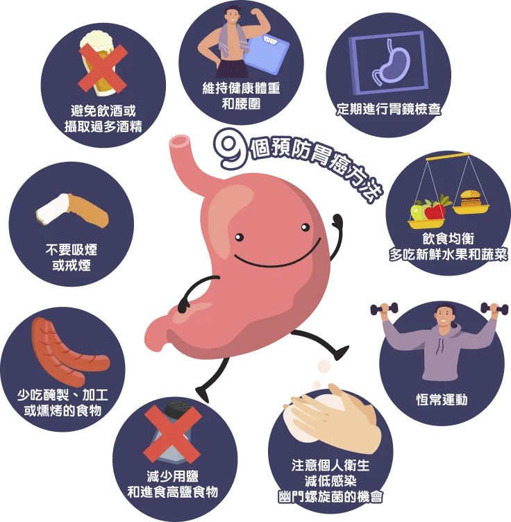 胃癌的早期症狀與胃炎、胃潰瘍或十二指腸潰瘍十分相似,因此不少人都會忽略胃癌帶來的風險和錯失治療的最佳時機。以下預防方法能夠減低患上胃癌的風險: