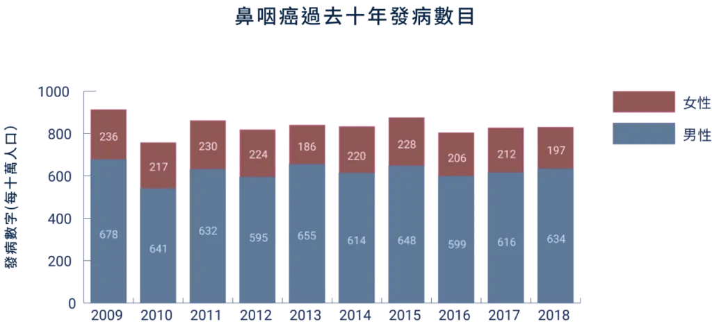 香港癌症資料統計中心數據顯示 (1),鼻咽癌在2018年位列香港男性最常見癌症第6位及女性最常見癌症第17位;當中男性患上鼻咽癌的機率較女性高出3倍,病發高峰期為40至55歲。