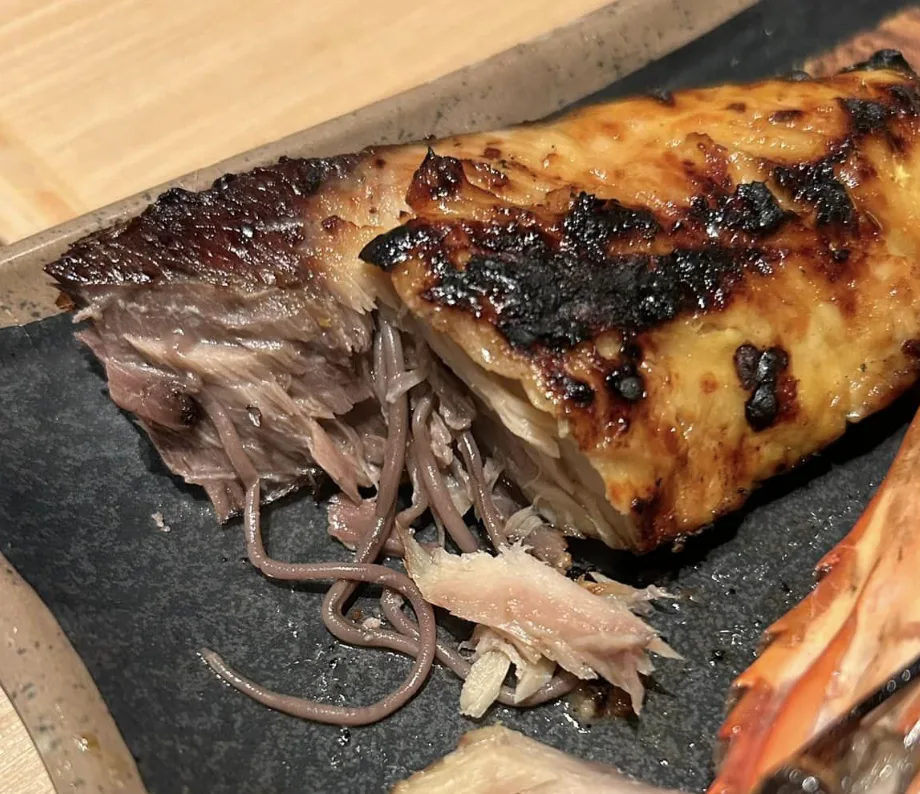 根據網上照片,餐廳內的桌面都有燒肉爐頭,相信要由顧客自行處理生肉。李小姐說,「燒之前已經覺得個樣麻麻唔太新鮮」,她燒魚後就跟丈夫將魚一分為二,「食左一啖有啲腥,之後老公撩到一條好似蟲嘅物體」,其後她們發現魚身裡面「有勁大渣蟲」。