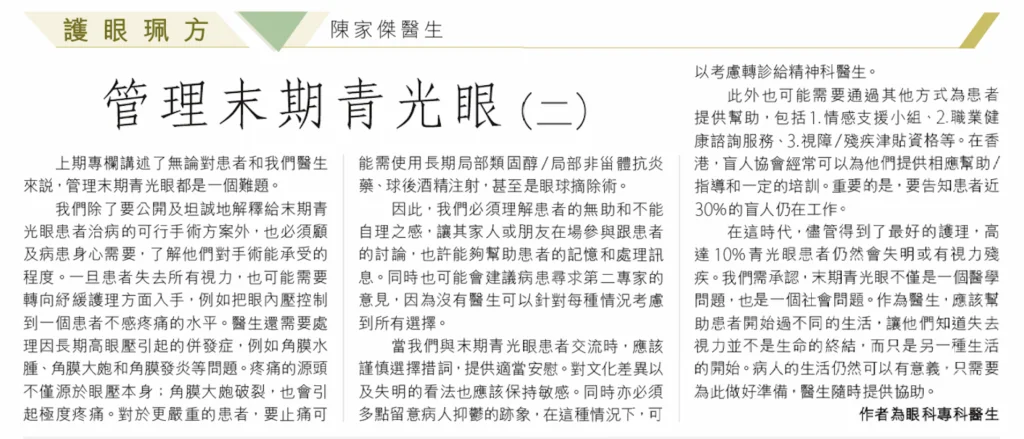 上期專欄講述了無論對患者和我們醫生來說,管理末期青光眼都是一個難題。