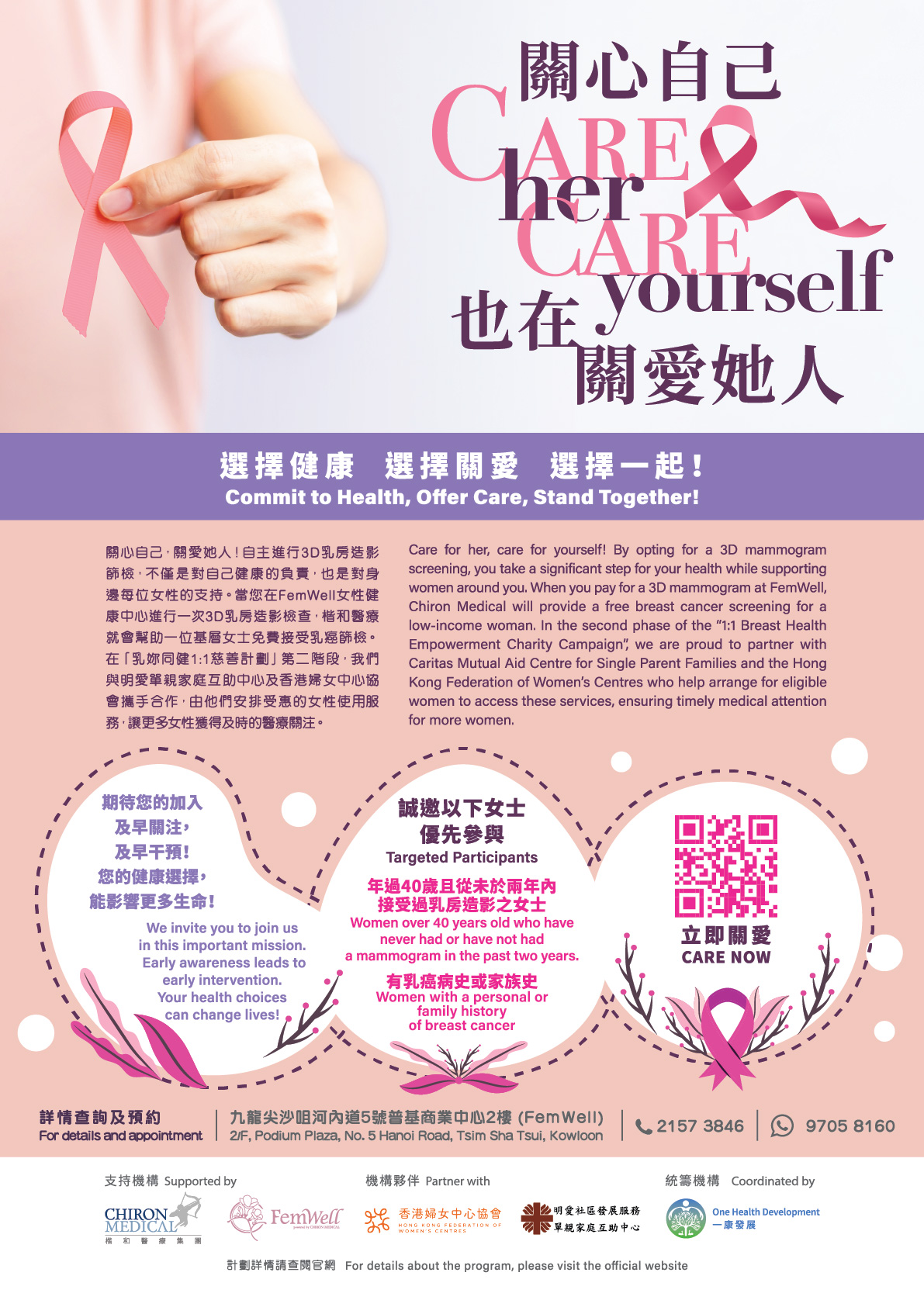 關心自己,關愛她人!自主進行3D乳房造影篩檢。不僅是對自己健康的負責,也是對身邊每位女性的支持。在「乳妳同健1:1慈善計劃」第二階段,我們與明愛單親家庭互助中心及香港婦女中心協會攜手,讓更多基層女性接受乳癌篩檢。
